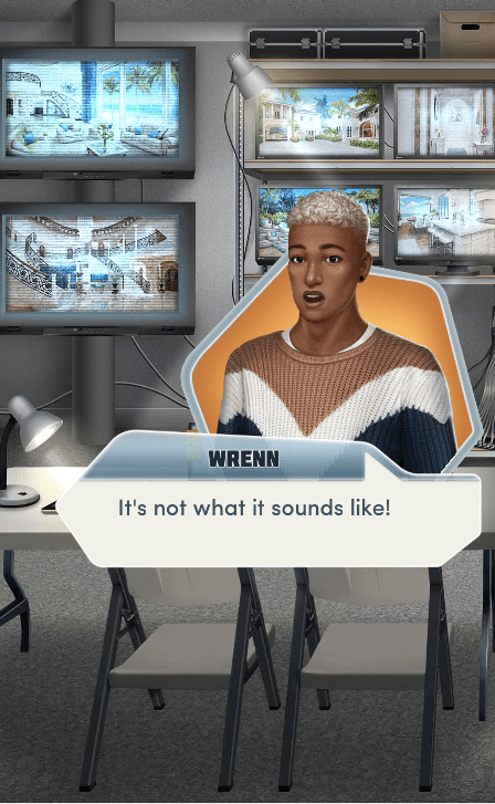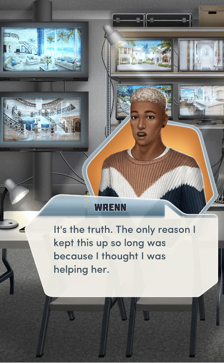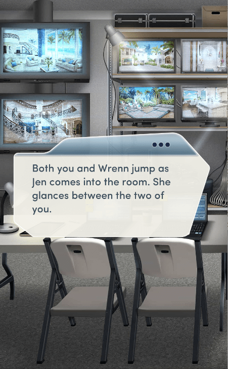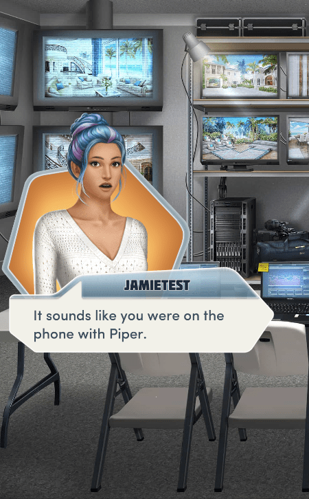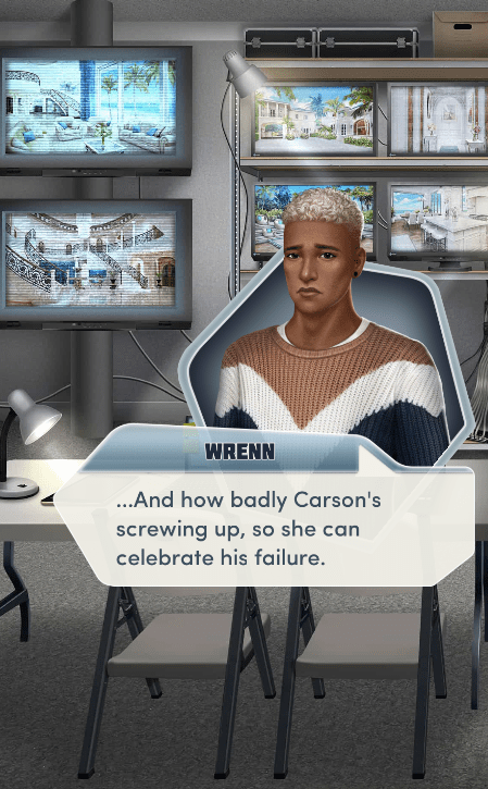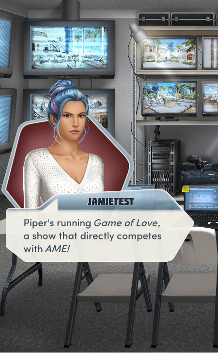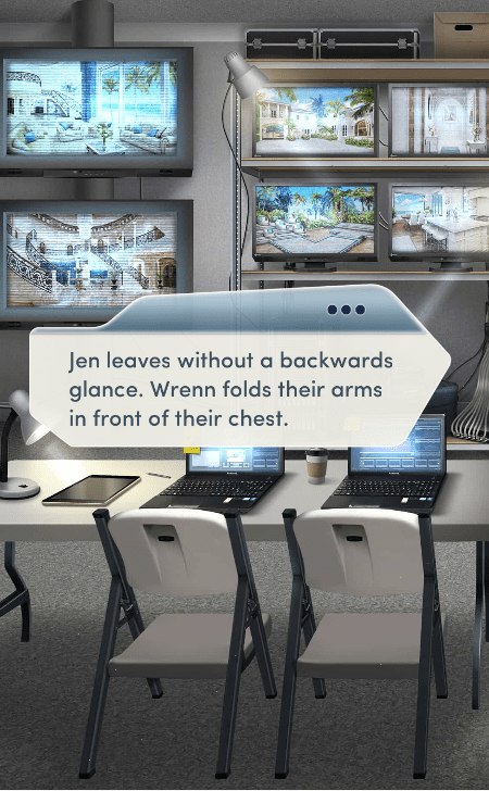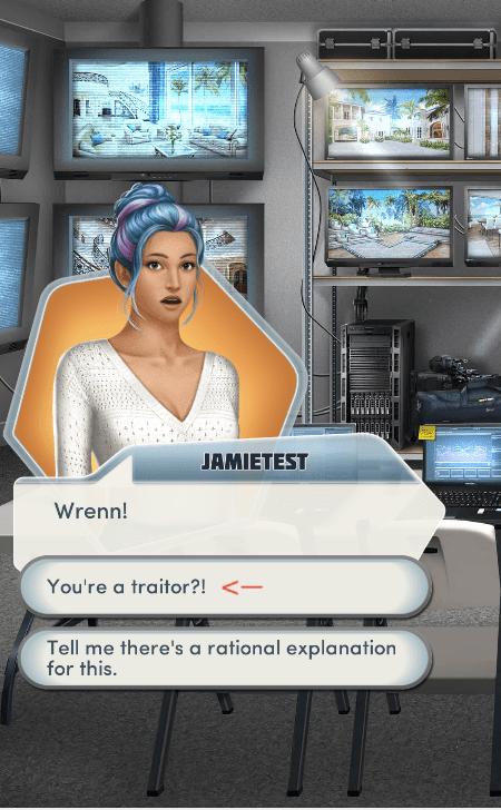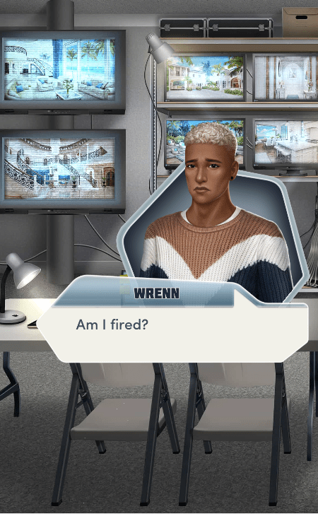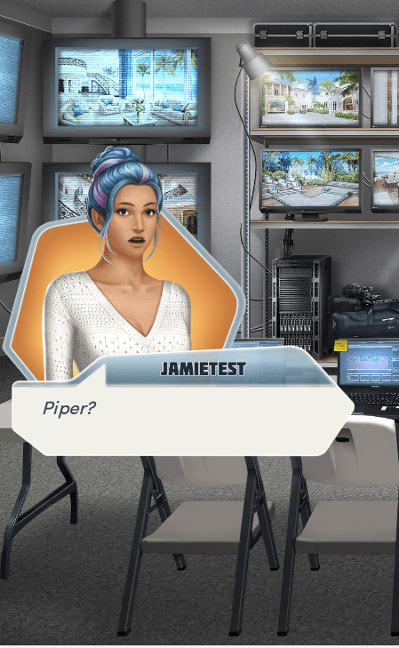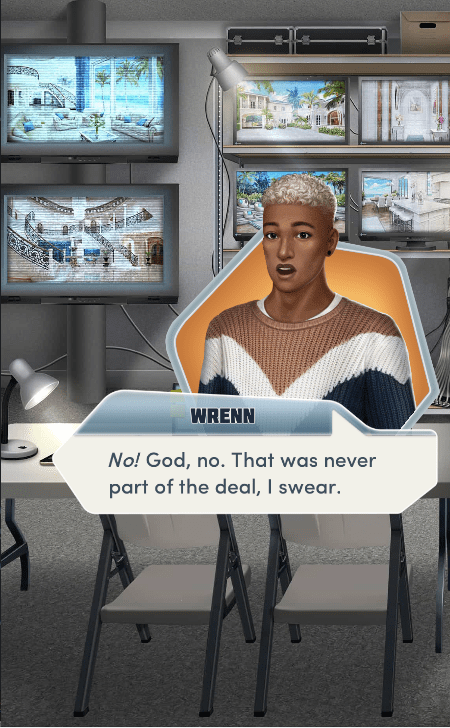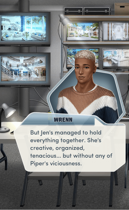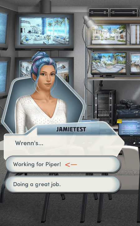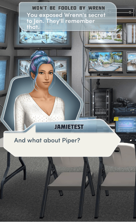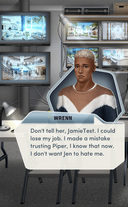 Context: In this scene, JamieTest (the player character) is a contestant on America’s Most Eligible, and walks in on intern Wrenn spilling secrets to Piper – AME‘s tyrannical former show runner who was fired in disgrace. It’s up to the player to hear Wrenn out and decide whether or not to report them to head producer Jen.