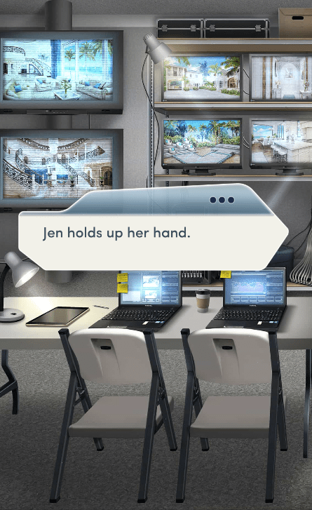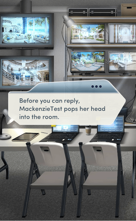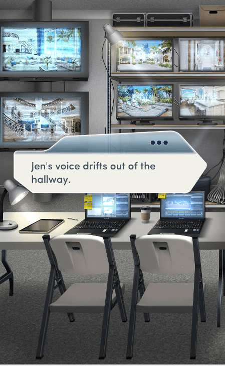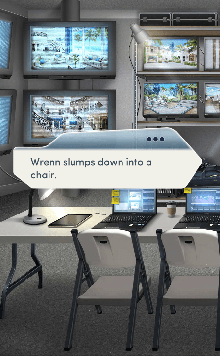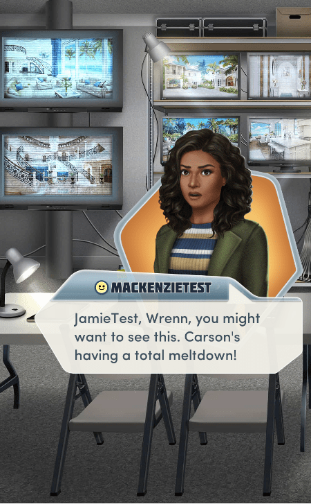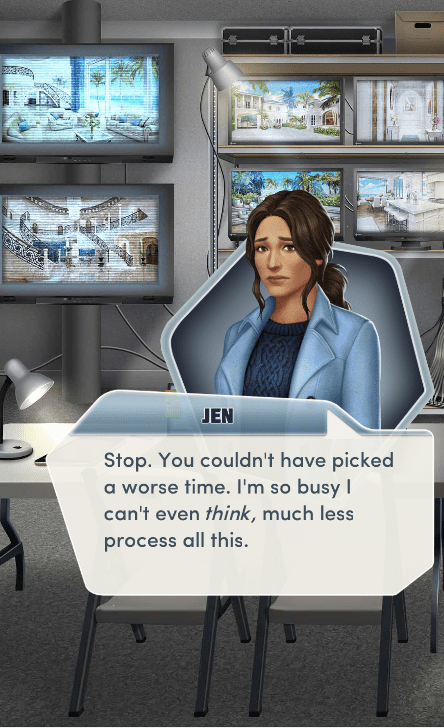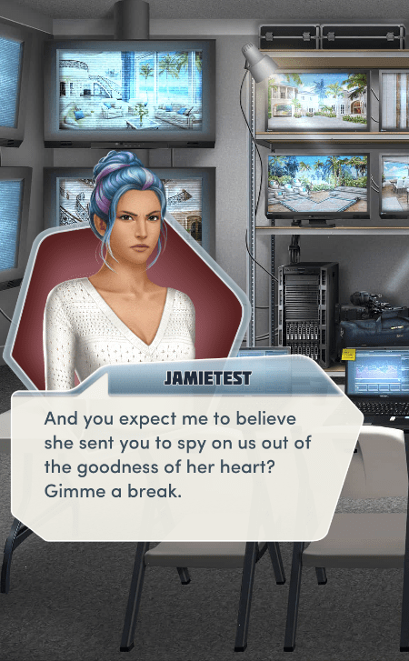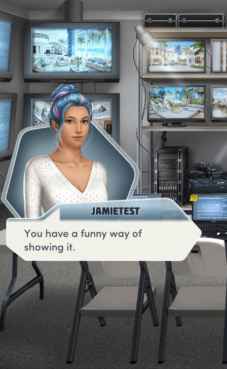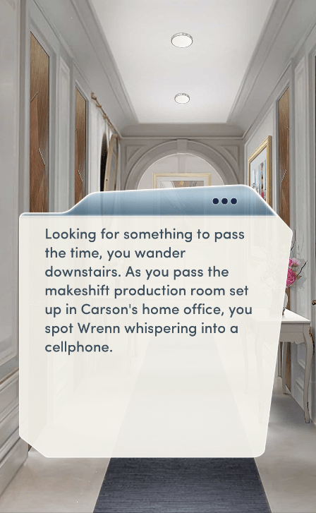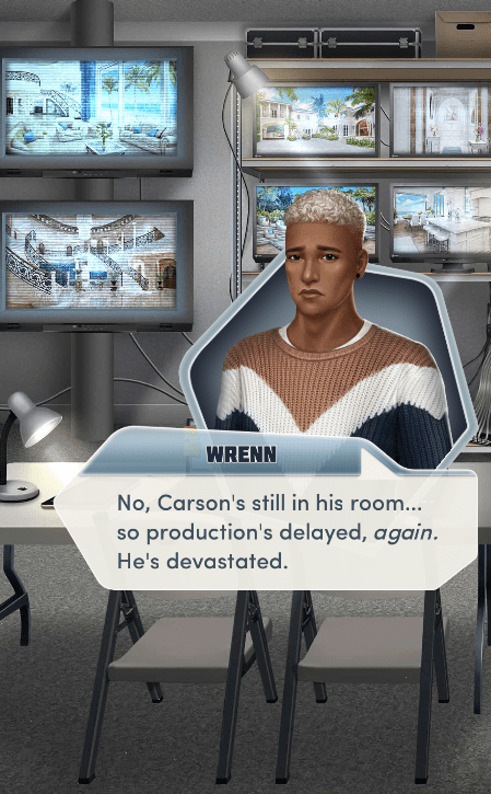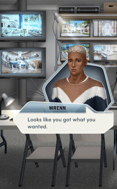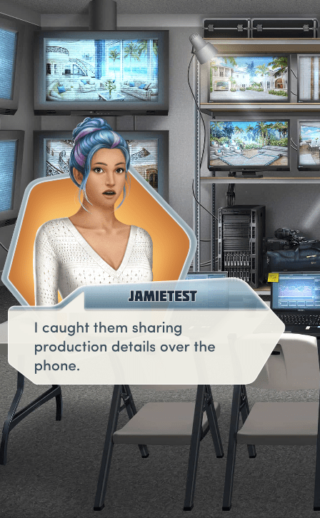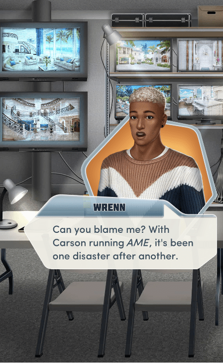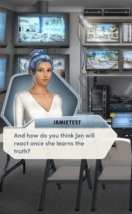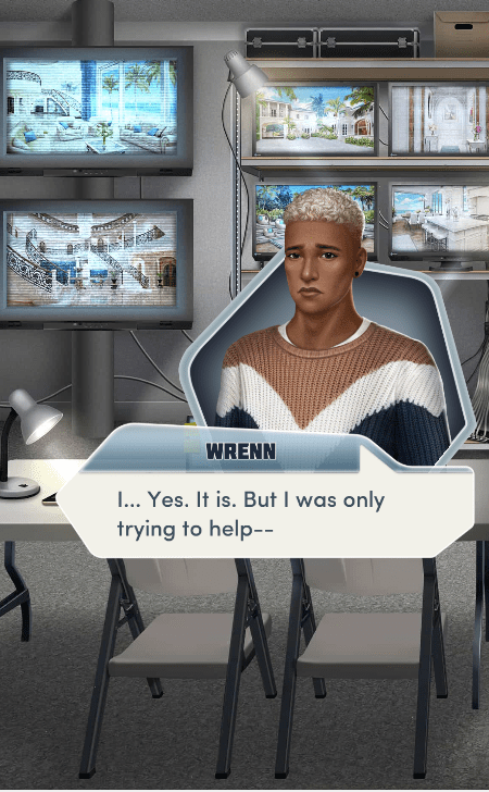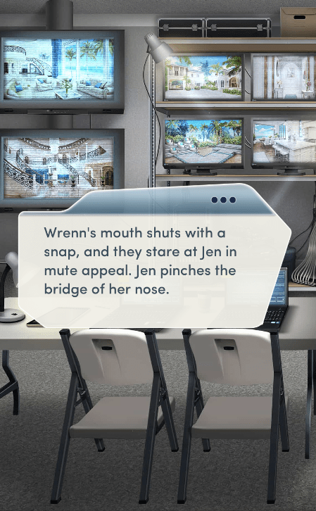Context: In this scene, JamieTest (the player character) is a contestant on America’s Most Eligible, and walks in on intern Wrenn spilling secrets to Piper – AME‘s tyrannical former show runner who was fired in disgrace. It’s up to the player to hear Wrenn out and decide whether or not to report them to head producer Jen.
