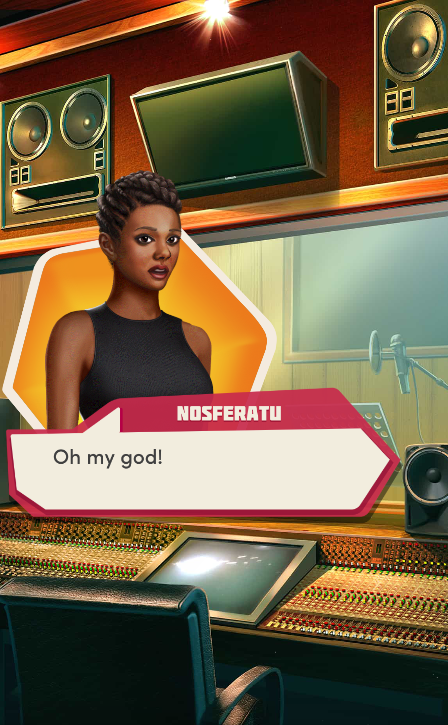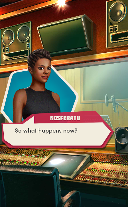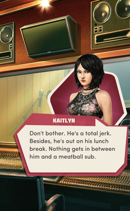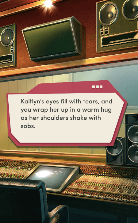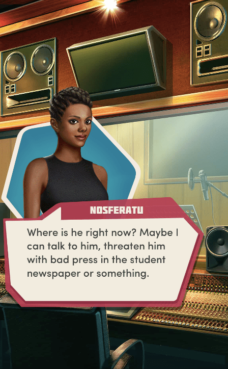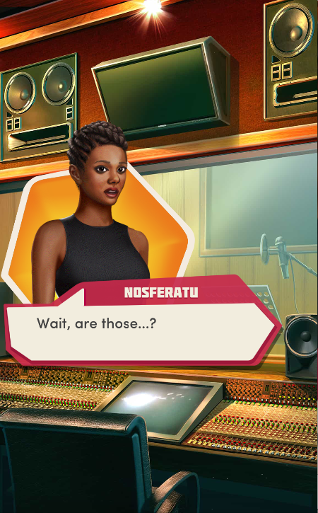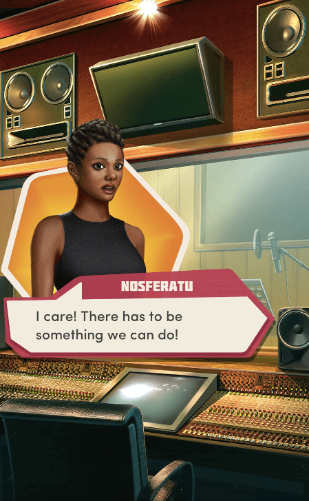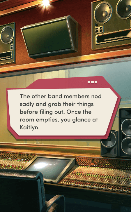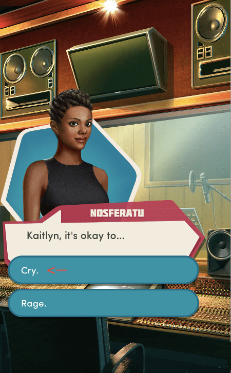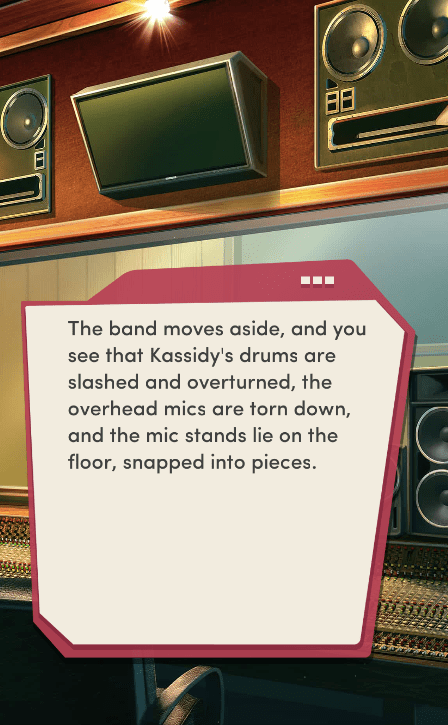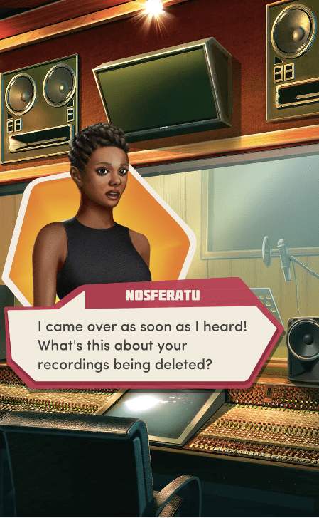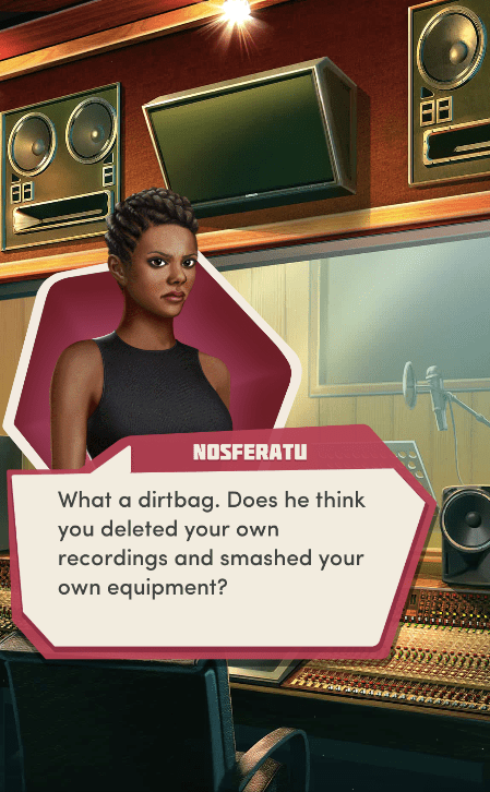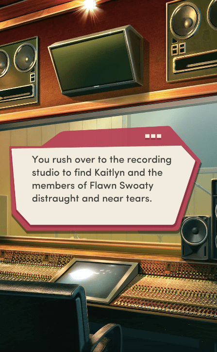 Context: In this scene, Nosferatu (the player character) is summoned to a recording studio by her friend Kaitlyn and her band Flawn Swoaty, who have just discovered they’re the victims of a malicious prank. Players can choose how to investigate, how to comfort Kaitlyn, and whether to take action against the saboteurs.