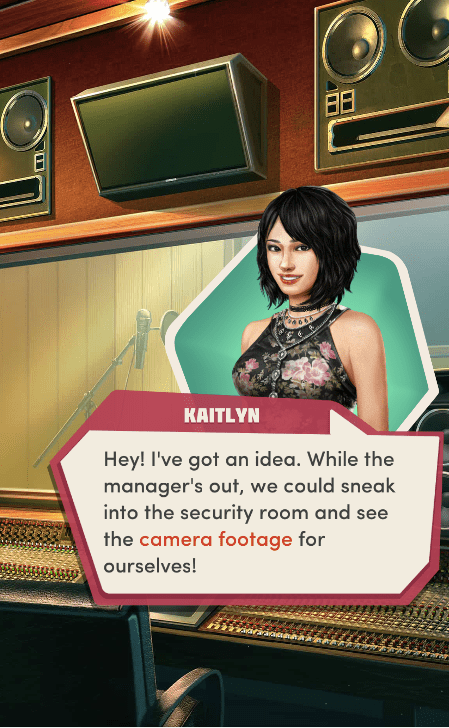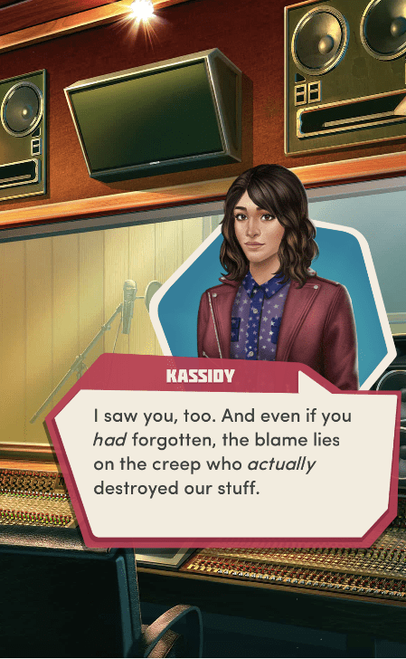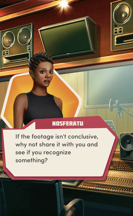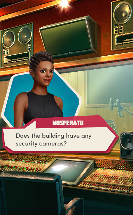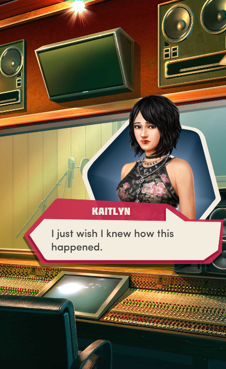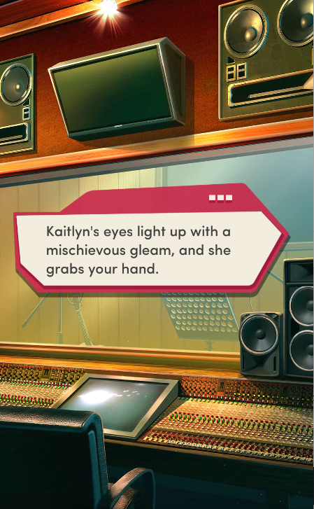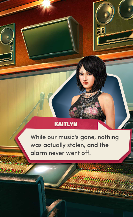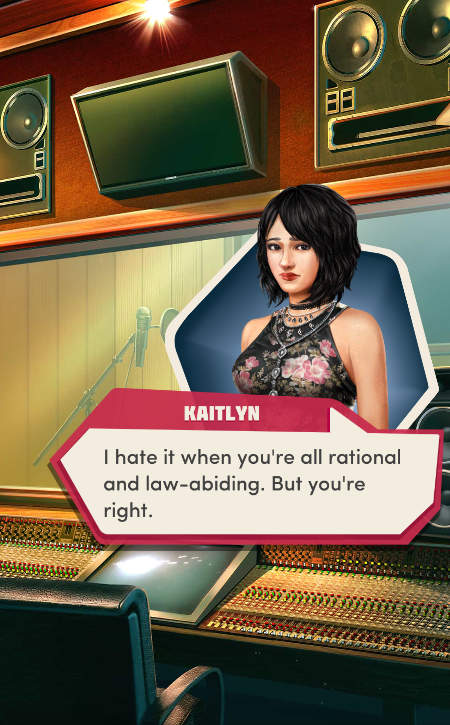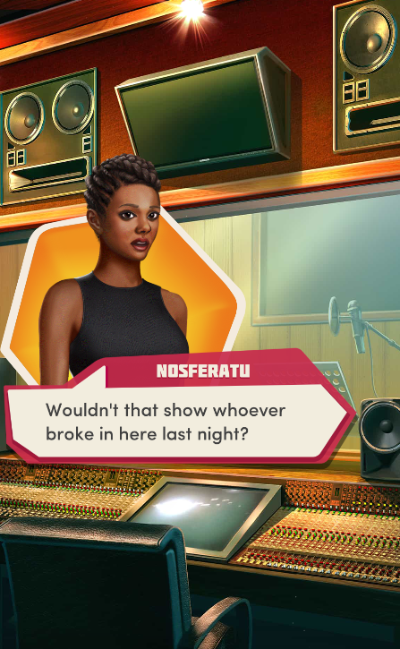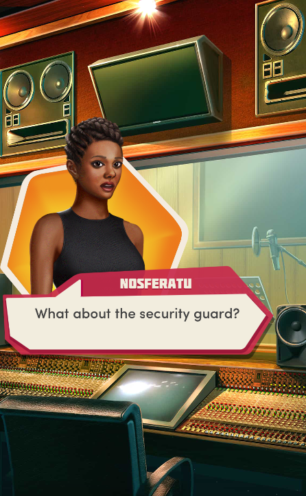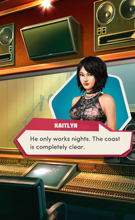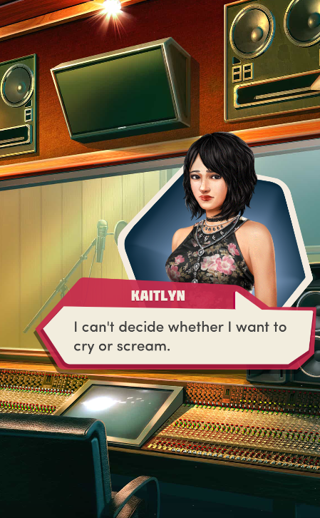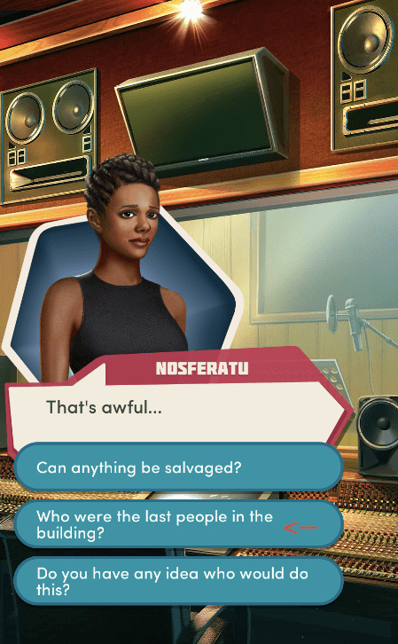 Context: In this scene, Nosferatu (the player character) is summoned to a recording studio by her friend Kaitlyn and her band Flawn Swoaty, who have just discovered they’re the victims of a malicious prank. Players can choose how to investigate, how to comfort Kaitlyn, and whether to take action against the saboteurs.