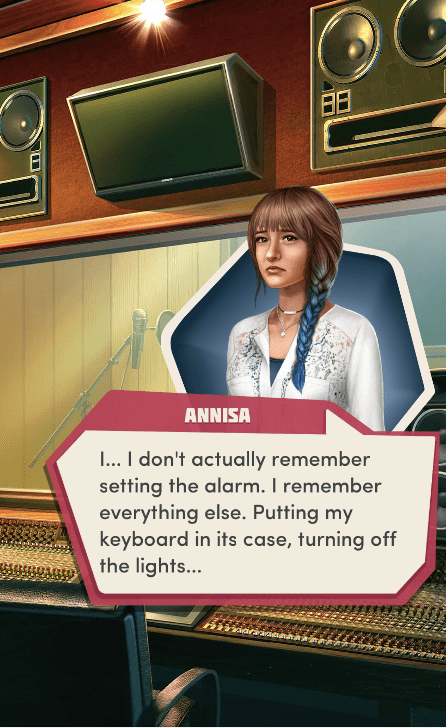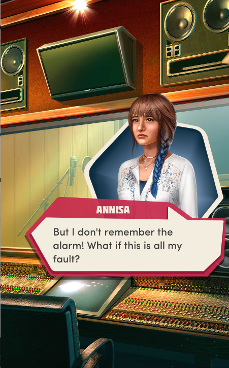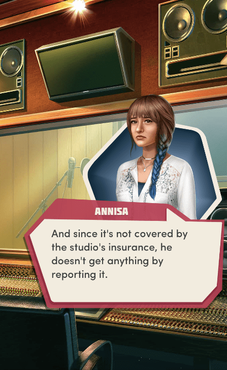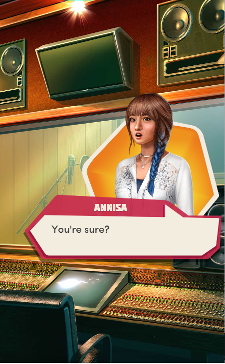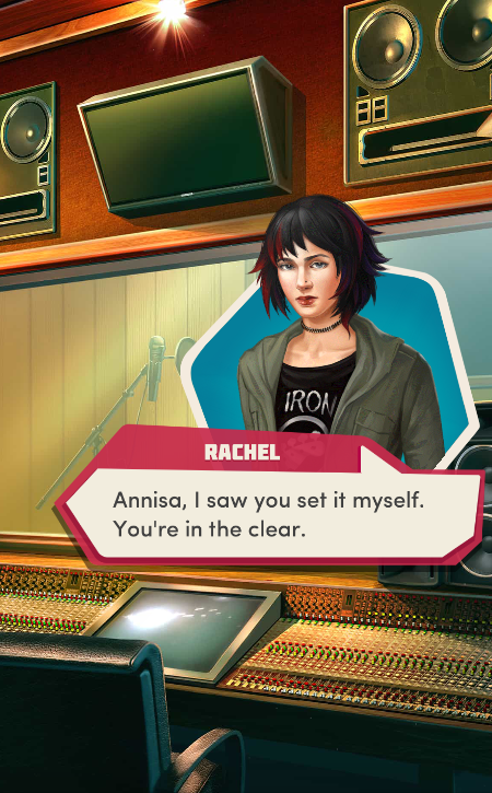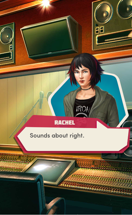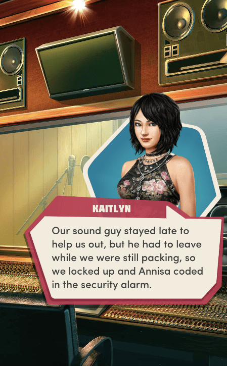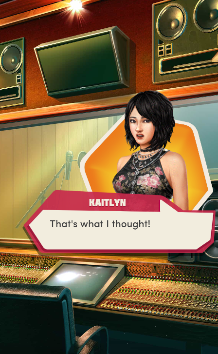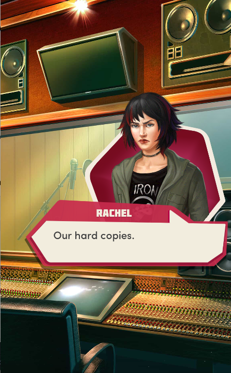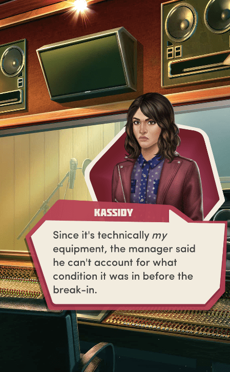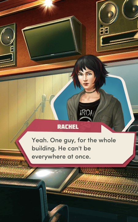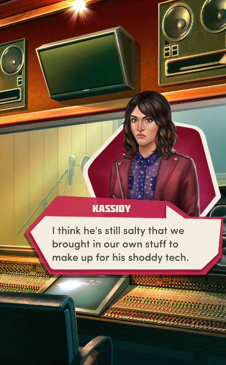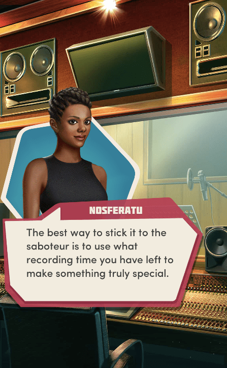 Context: In this scene, Nosferatu (the player character) is summoned to a recording studio by her friend Kaitlyn and her band Flawn Swoaty, who have just discovered they’re the victims of a malicious prank. Players can choose how to investigate, how to comfort Kaitlyn, and whether to take action against the saboteurs.